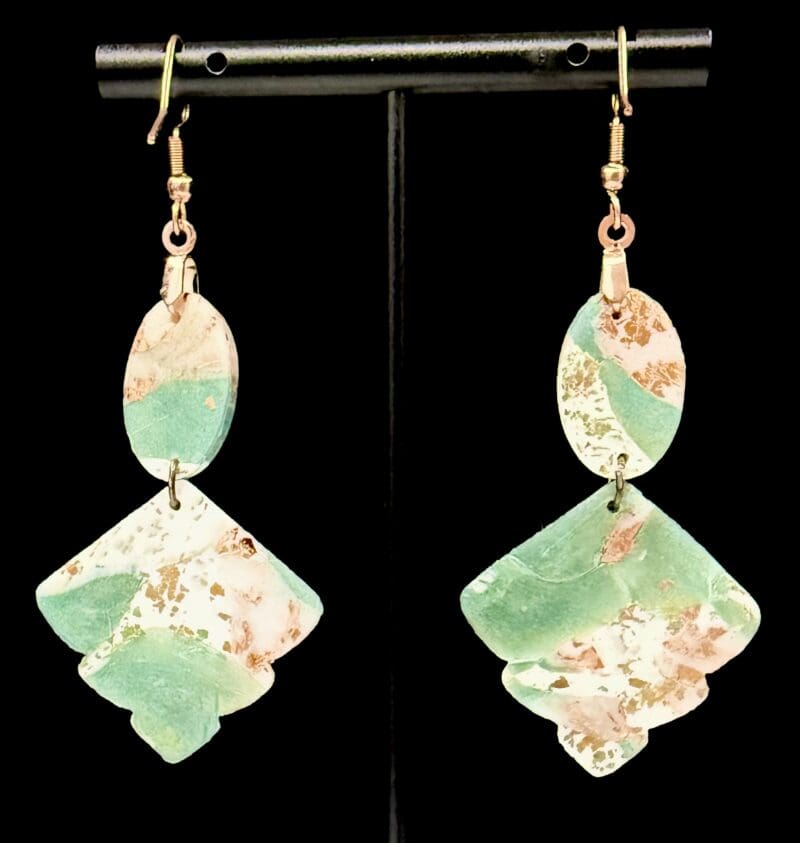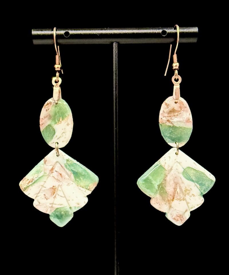 Gentle swirls of soft green, ivory, and rose-gold leaf come together in a calm, earthy shimmer. The Smokey Jade Collection draws from stone and smoke — each earring hand-layered from translucent polymer clay, allowing light to breathe through the surface. No paint, no transfer, no surface additives beyond the metallic accents — only the natural motion of clay revealing tone and depth.