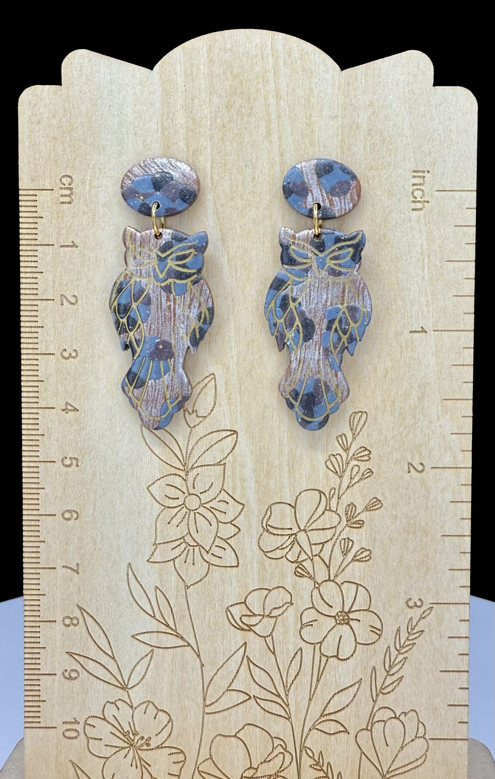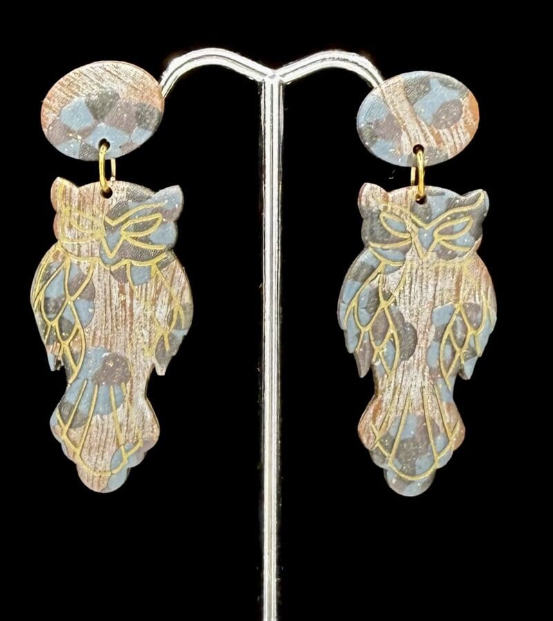 From the Woodland Inspired Collection, these Spotted Owl earrings bring a touch of quiet strength and mystery to any look. Crafted in polymer clay, they feature hand-mixed shades of slate blue, copper, and taupe, accented with subtle metallic tones that create natural depth. The design gives the illusion of detailed feather work, highlighted by a satin gloss finish that softens the surface without overpowering the form. Anchored by an oval stud, each piece flows into the owl silhouette — a timeless symbol of wisdom and intuition.