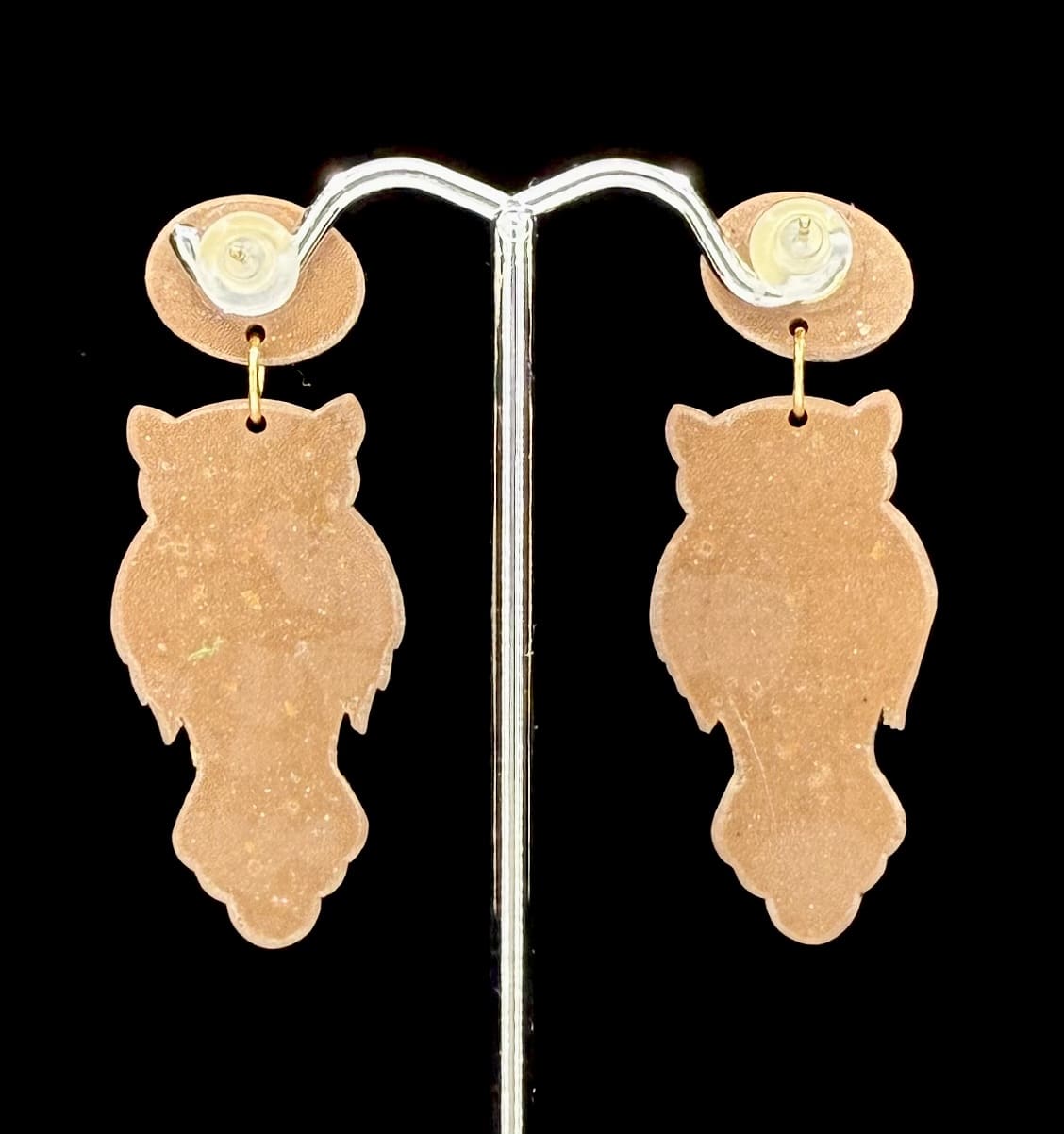 Spotted Owl earrings in polymer clay with metallic blends and satin gloss finish — lightweight statement studs with woodland charm.