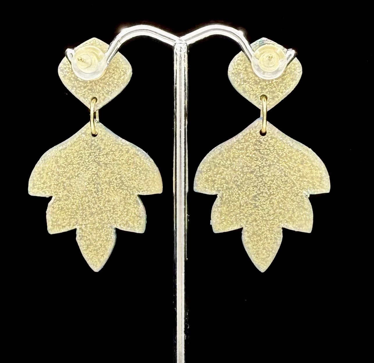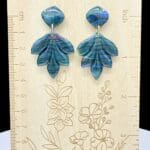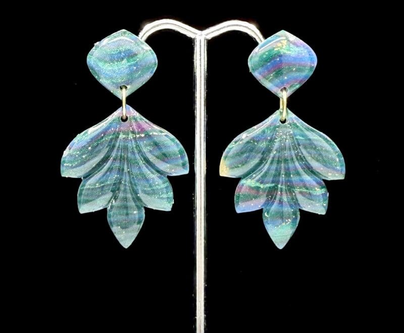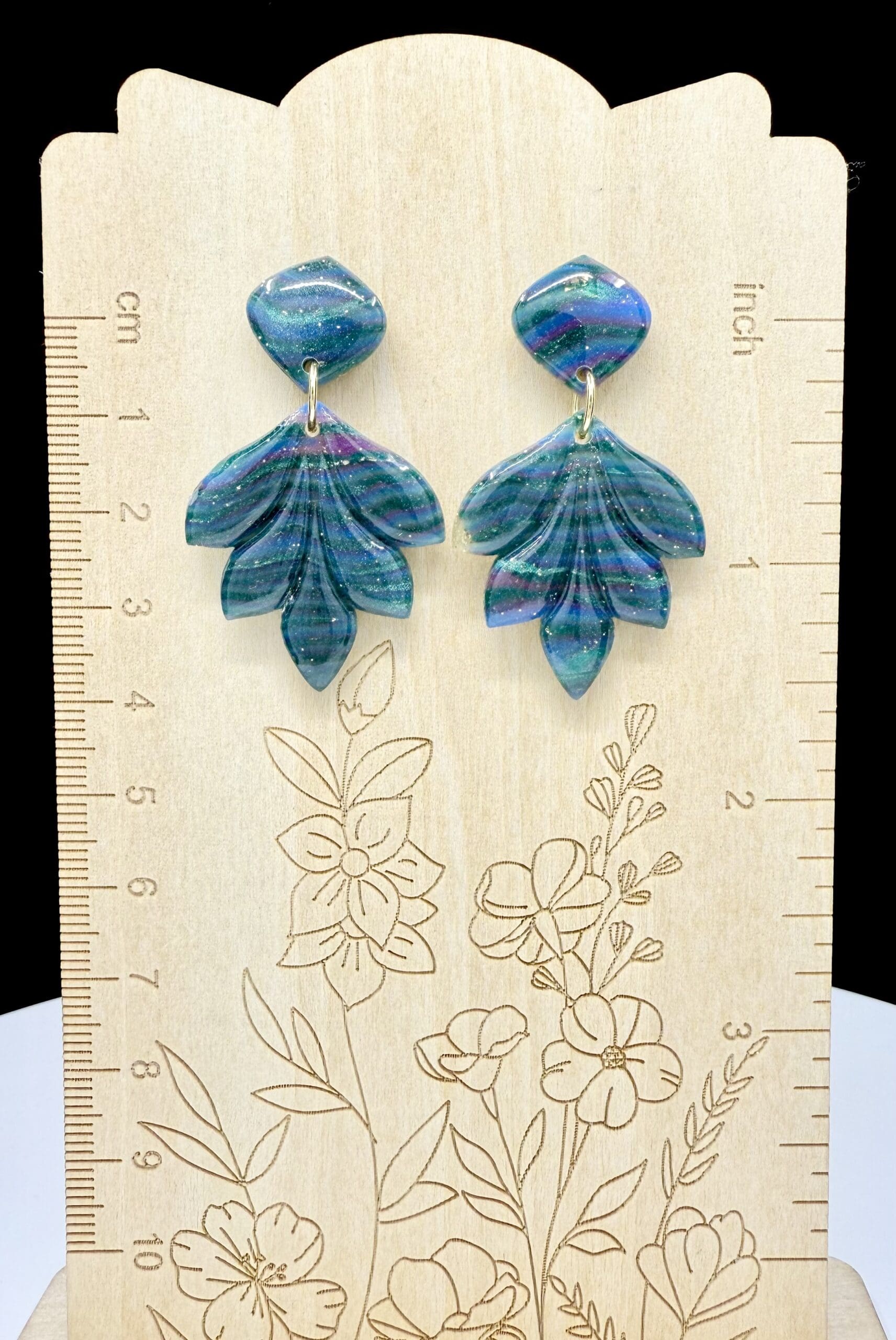 From the Stained Glass Collection, these layered drop earrings use custom translucent clay to create a deep, luminous effect. Shades of indigo, violet, and midnight blue shift subtly in the light, with scattered flecks of shimmer that recall starlight on stained glass. The petal-like layers cascade downward, giving these earrings a graceful flow, while the glossy resin finish enhances depth and brilliance.
