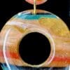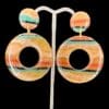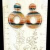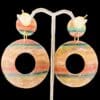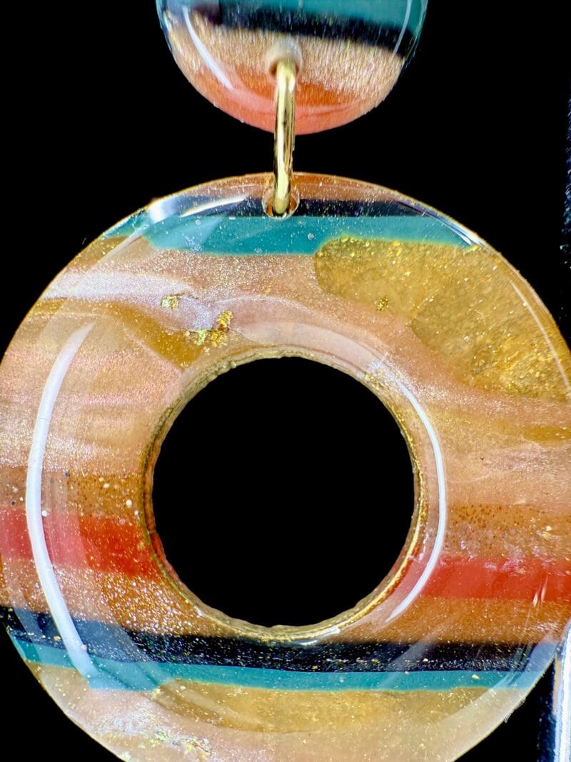 These vibrant round-drop earrings feature layered stripes of teal, metallic gold, coral-red, and deep black over a warm neutral base. The glossy surface amplifies the shimmer in the pigments, giving the design a polished, reflective finish that shifts beautifully in the light.