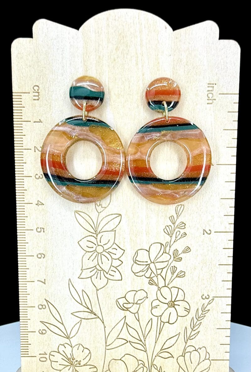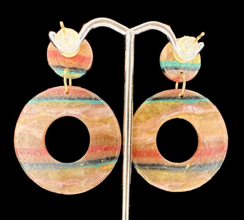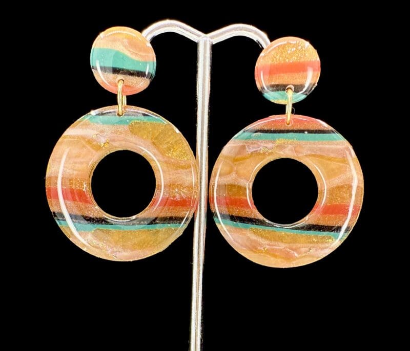 Lightweight Teal & Sunset striped clay earrings with layered shimmer, high-gloss resin, and gold-plated hypoallergenic posts for a bold, comfortable look. See this clay mix in the sun here: https://www.facebook.com/share/r/1FBus6vRE2/
