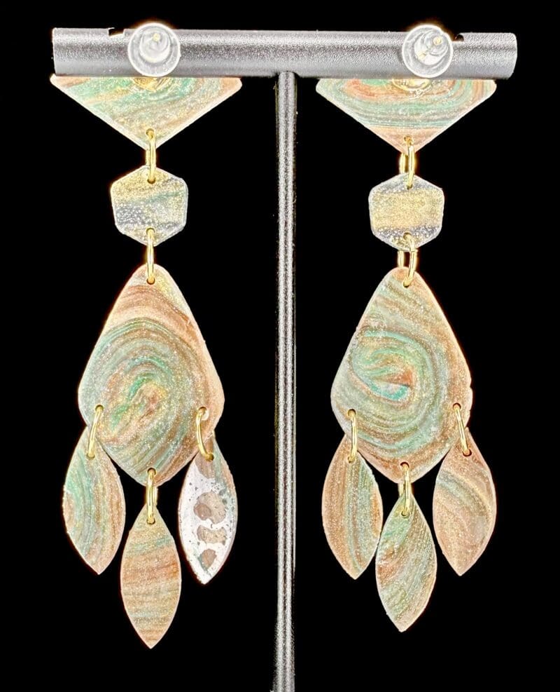 Layered geometric forms stack and sway, blending teal and sunset tones into a bold yet balanced statement. Striking movement with an earthy, sculptural feel. See how they were made here: https://www.facebook.com/share/v/19raErau7u/