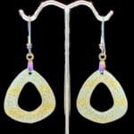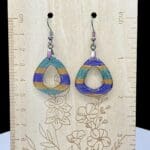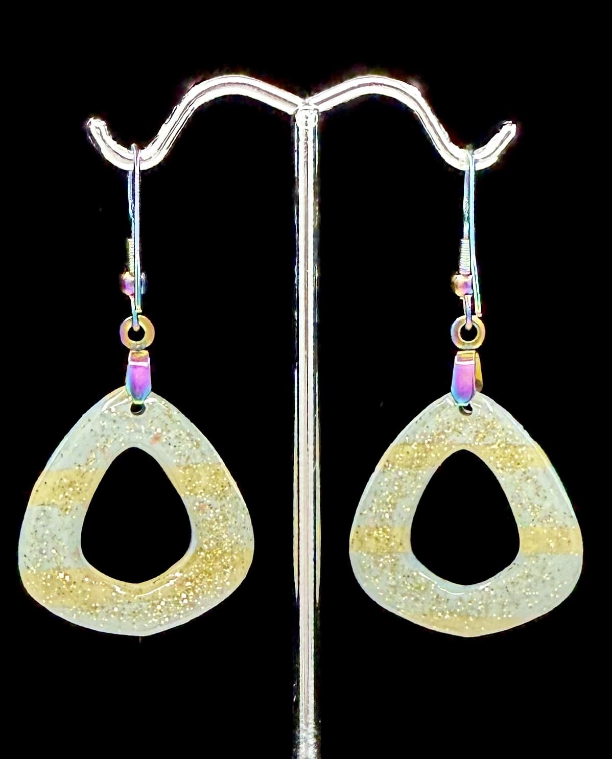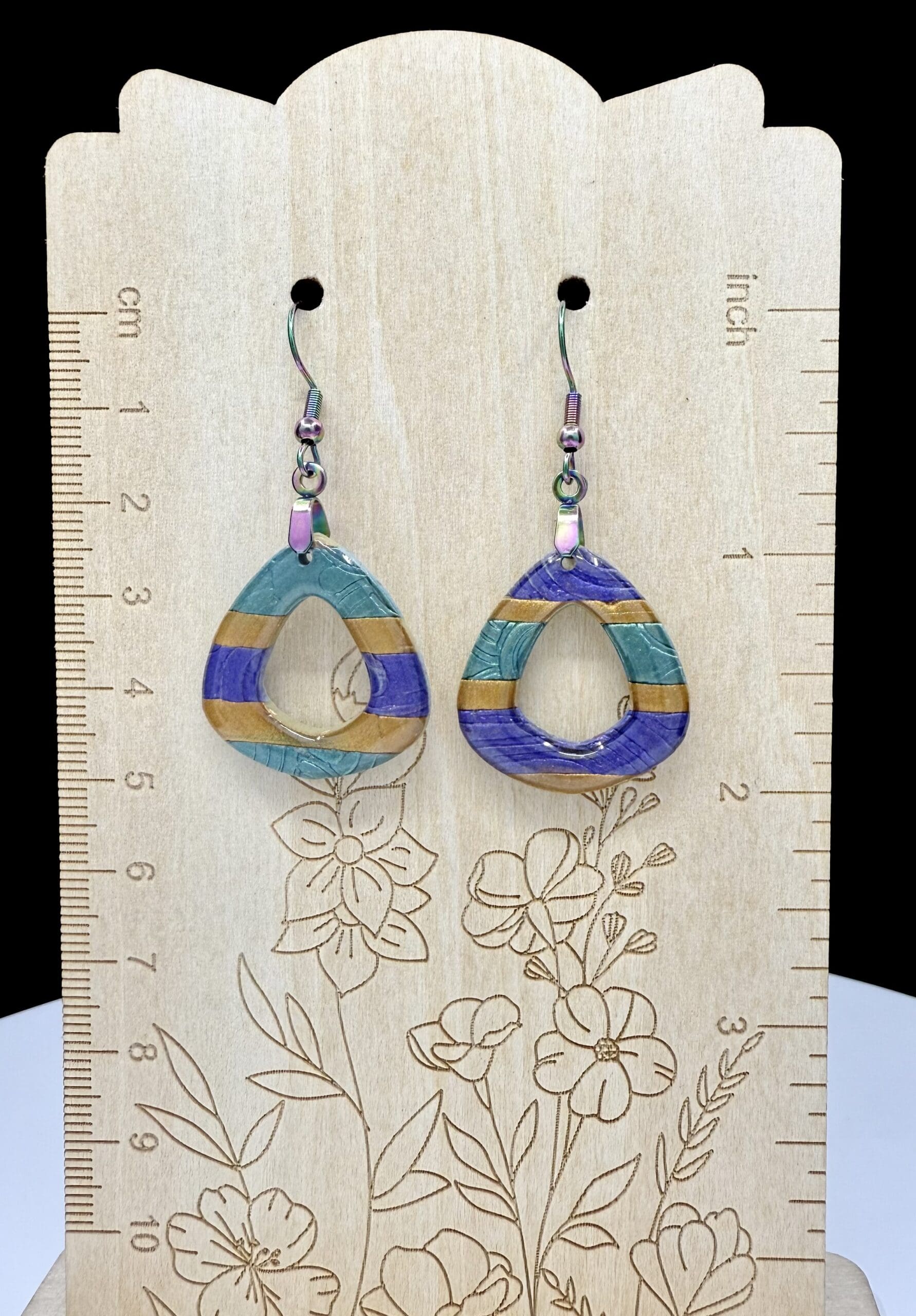Open triangle drop earrings in violet, teal, and gold striping with velvet-inspired embossing and glitter resin backing. Lightweight, bold, and one of a kind.