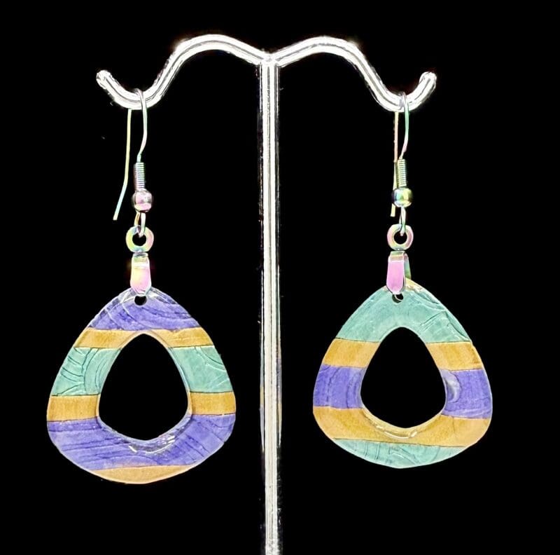 The Velvet-Inspired Open Triangle Drop Earrings bring a playful spin to a classic silhouette. Hand-mixed polymer clay in Mardi Gras–inspired hues of violet, teal, and golden striping creates a bold, festive look. The embossed striping adds a velvet-inspired touch of texture, while the open triangle drop design feels modern and light.