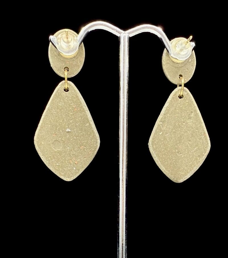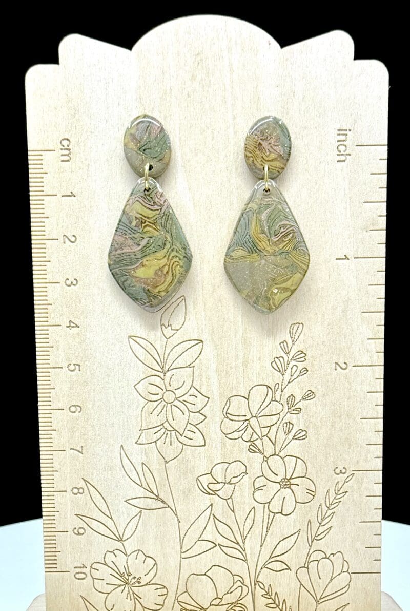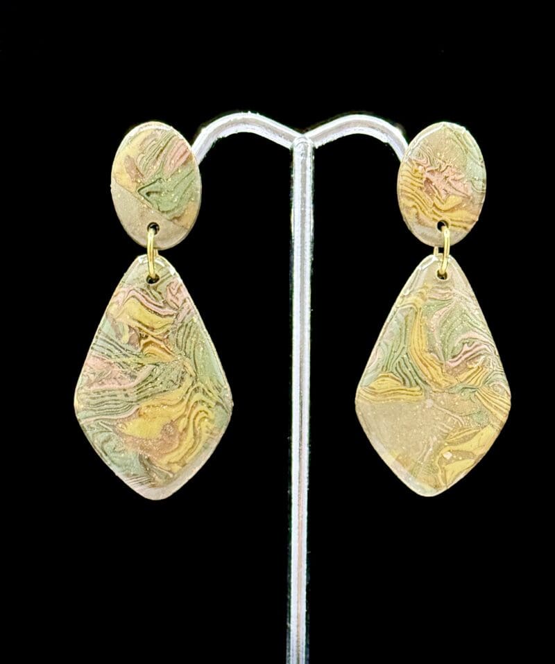 Soft marbling meets gentle movement in these teardrop dangles, capturing a vintage whisper through translucent layers of rose, sage, and gold clay. Every swirl is part of the clay itself — no paint, no surface design — only the natural rhythm of blended tones sealed under a glass-like resin finish.