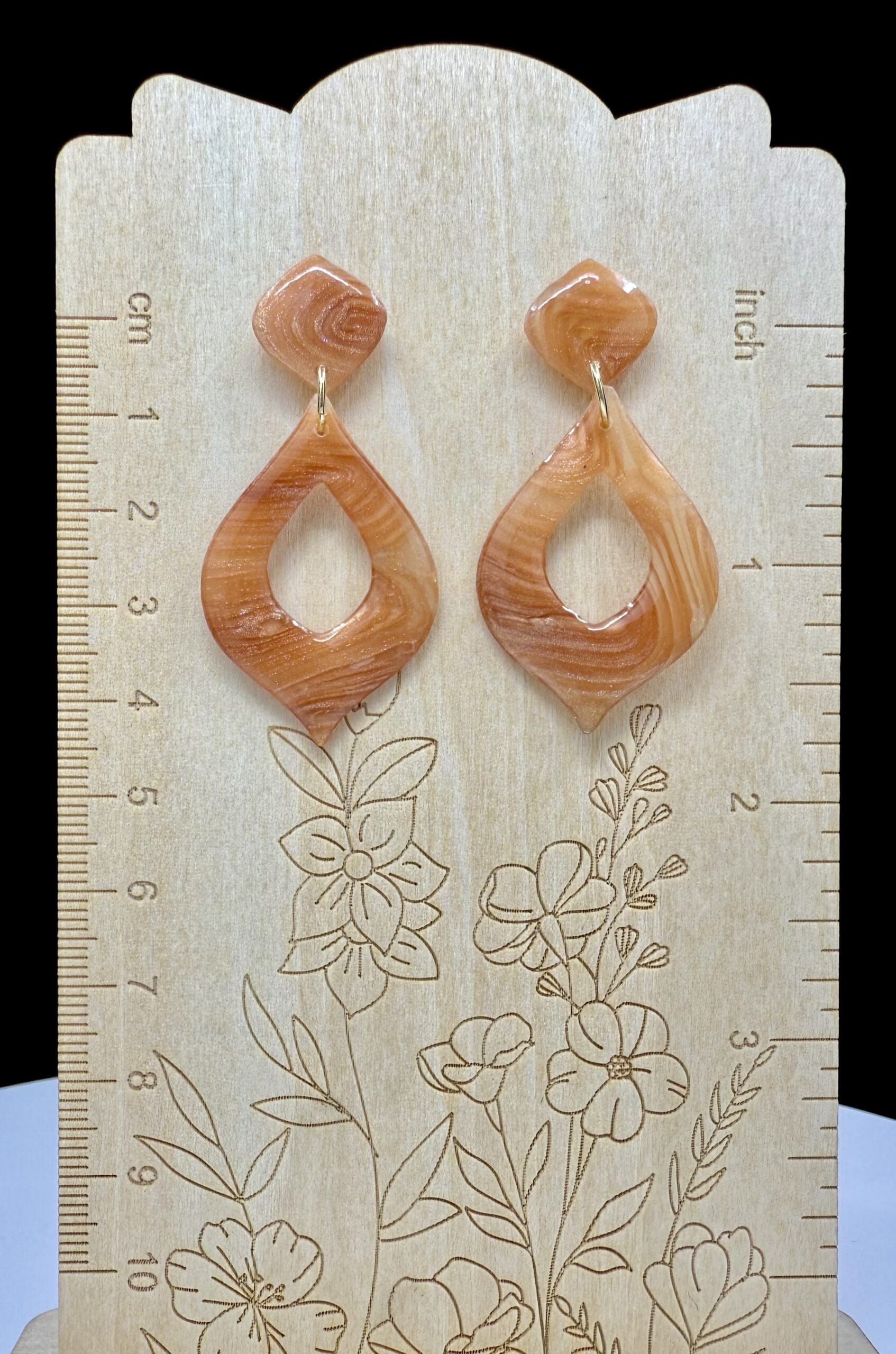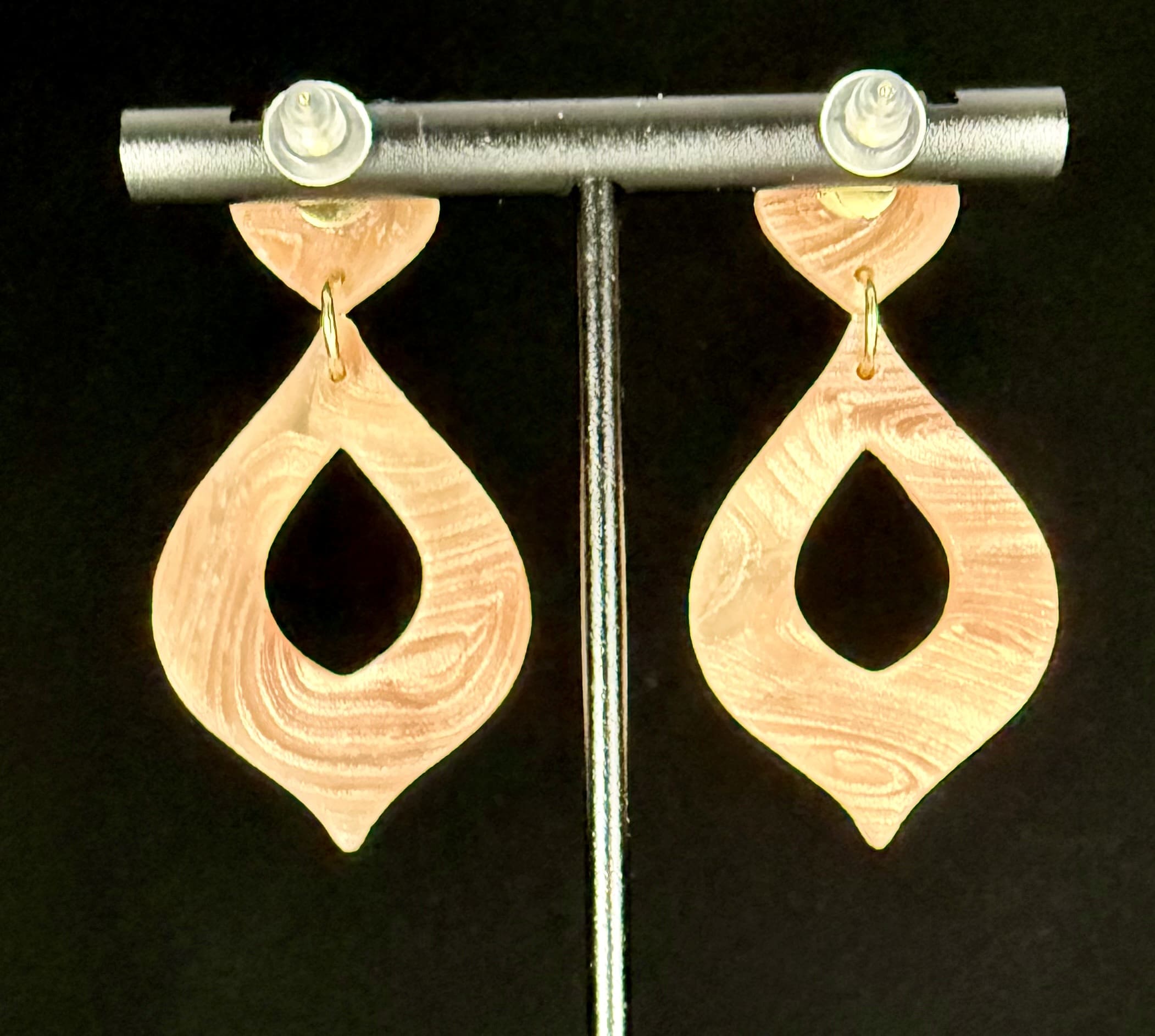 From the Woodgrain Collection, these open marquise earrings reflect the smooth rhythm of natural grain lines and warm amber mica tones. Each pair is cut directly from polymer clay layered with fine mica to emulate the polished look of wood — soft shimmer, subtle depth, and a flowing, organic pattern beneath a glass-smooth resin finish.