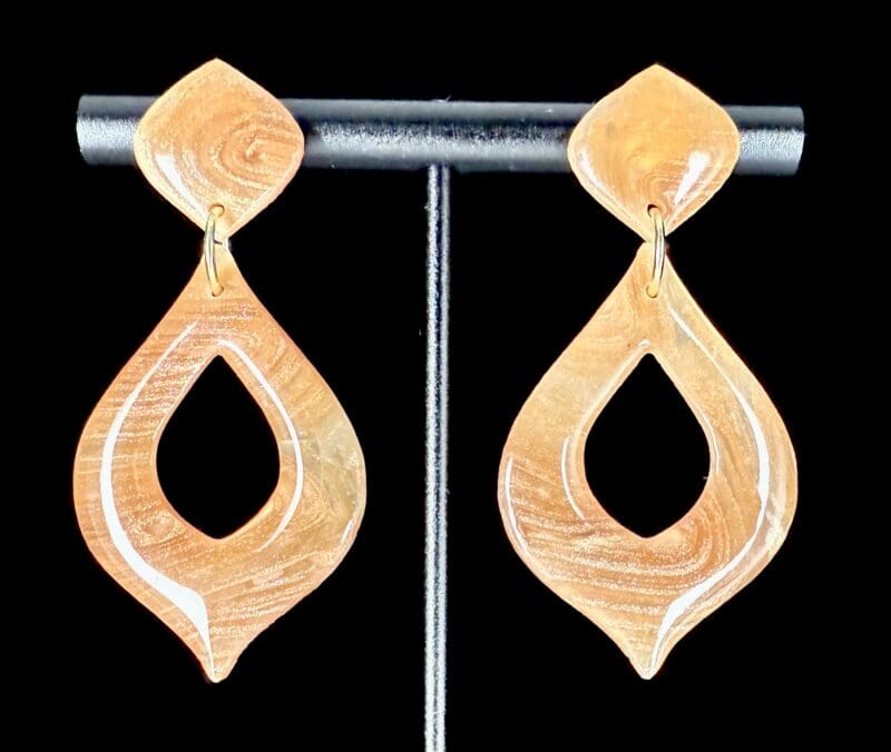 Amber-gold mica layers flow like polished wood — lightweight open marquise earrings from the Woodgrain Collection. See them in the natural sunlight here: https://www.facebook.com/share/r/18kCqhADTu/