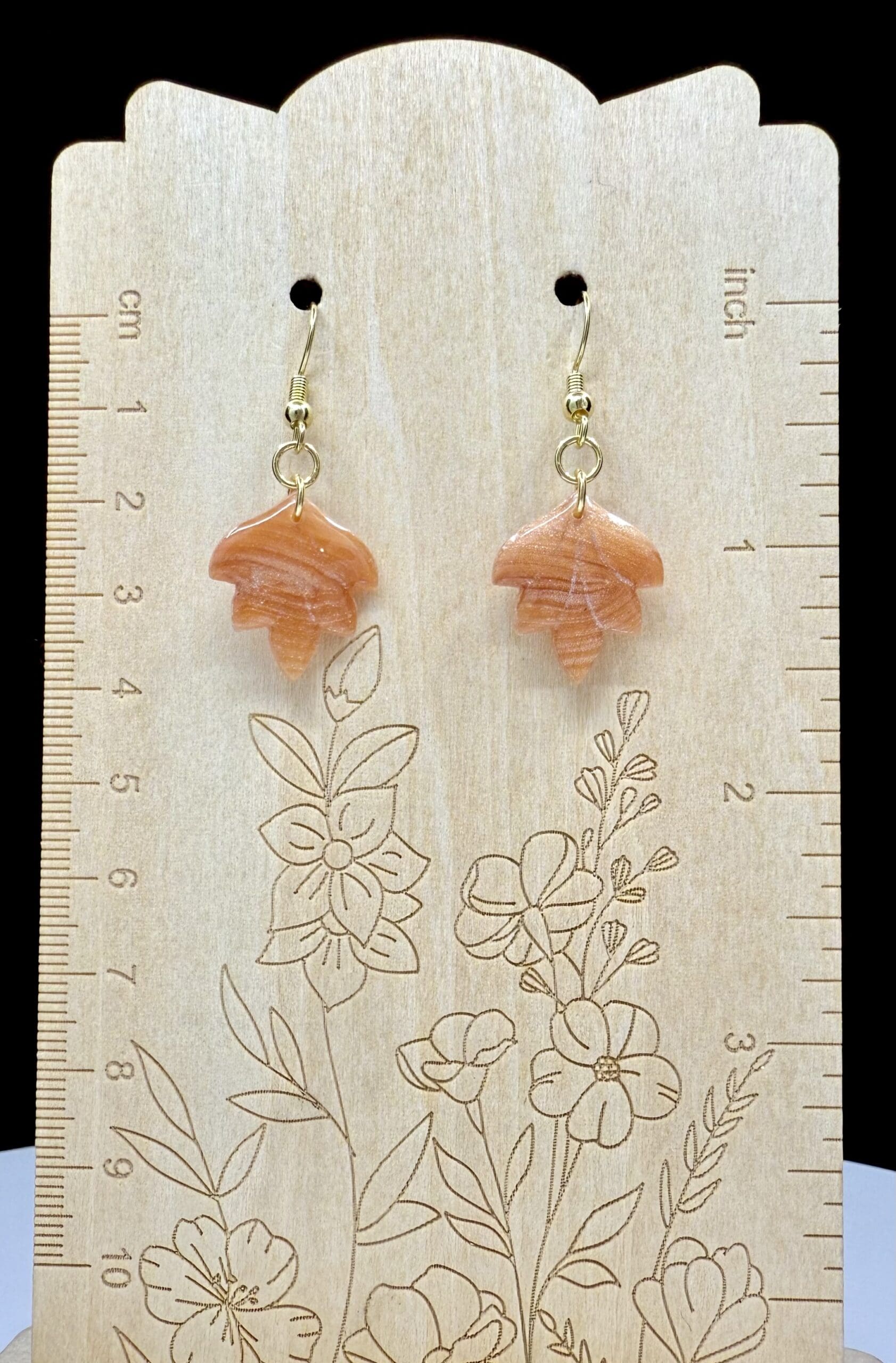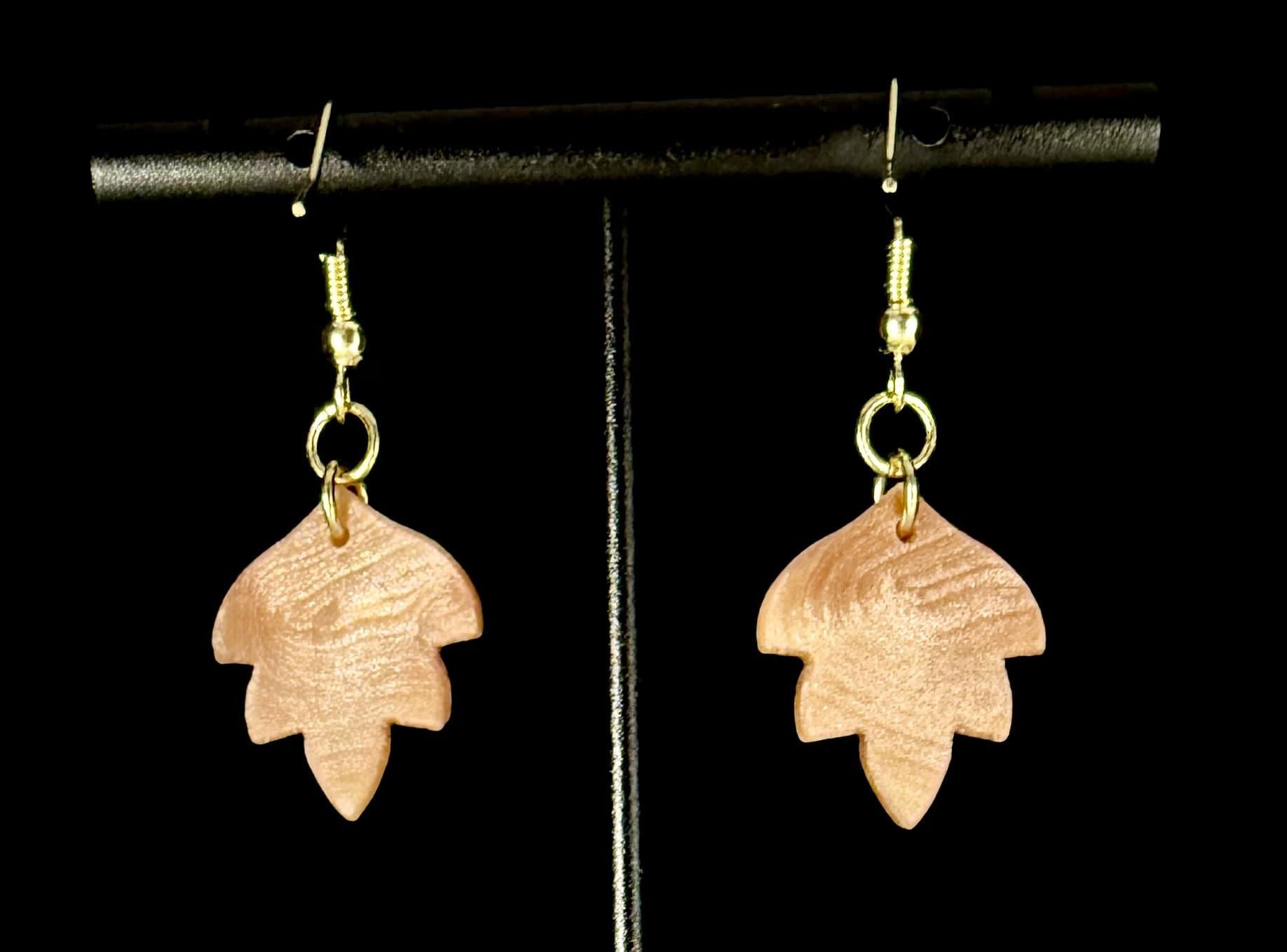 From the Woodgrain Collection, these small leaf drops carry the same layered mica depth and smooth, organic flow that define the series. Each pair is cut directly from polymer clay blended to emulate the shifting warmth of natural woodgrain — soft amber, subtle shimmer, and an almost silky reflection under light.