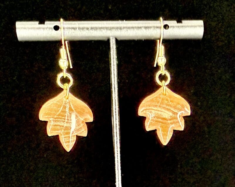 Amber-toned mica and natural woodgrain flow — small leaf drops that bring organic warmth and effortless shine. See them in the natural sunlight here: https://www.facebook.com/share/r/19wvMhzAcw/